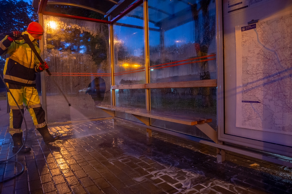 Pracownik firmy porządkowej myje wiatę przystankową myjką ciśnieniową, jest noc